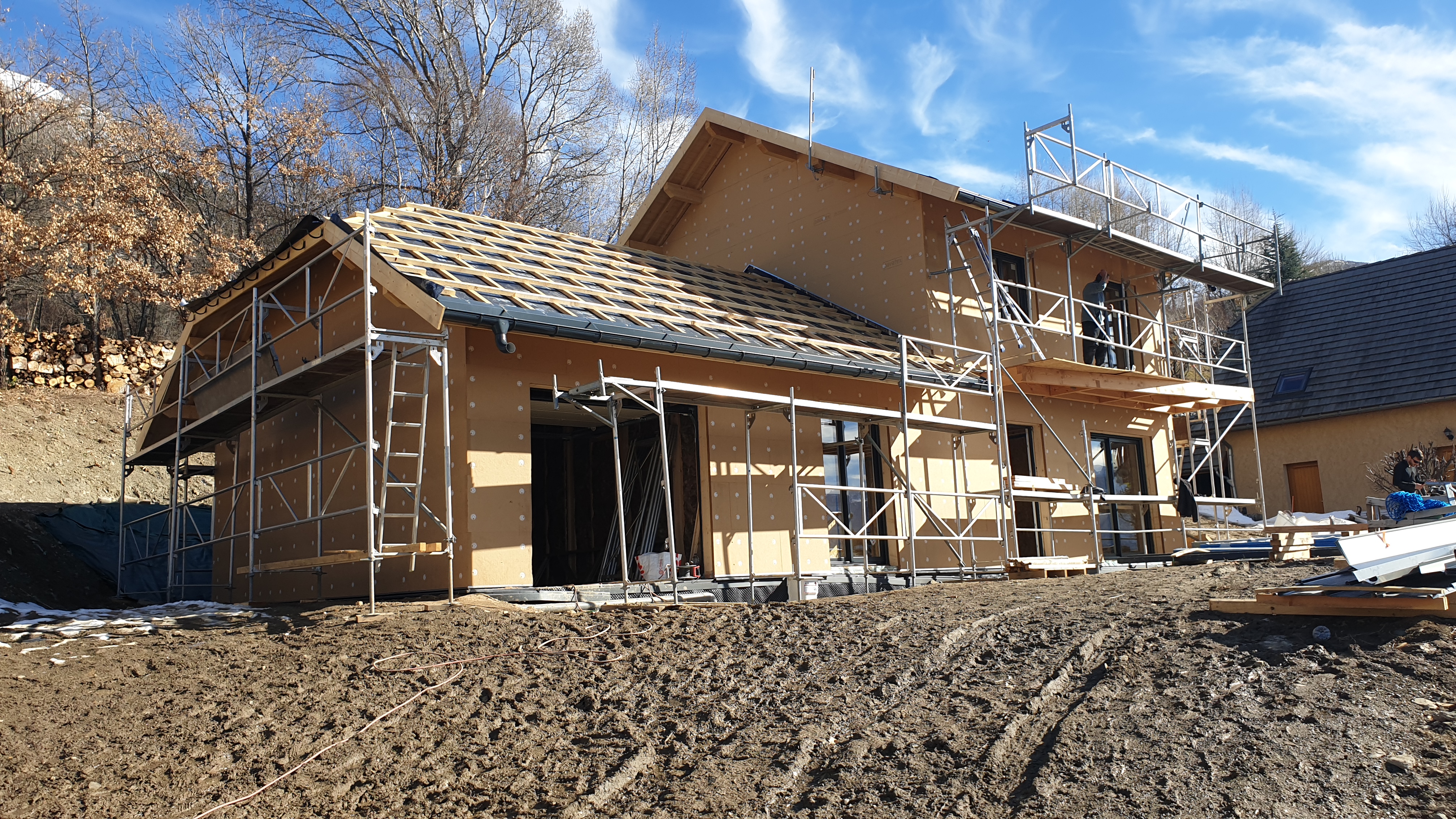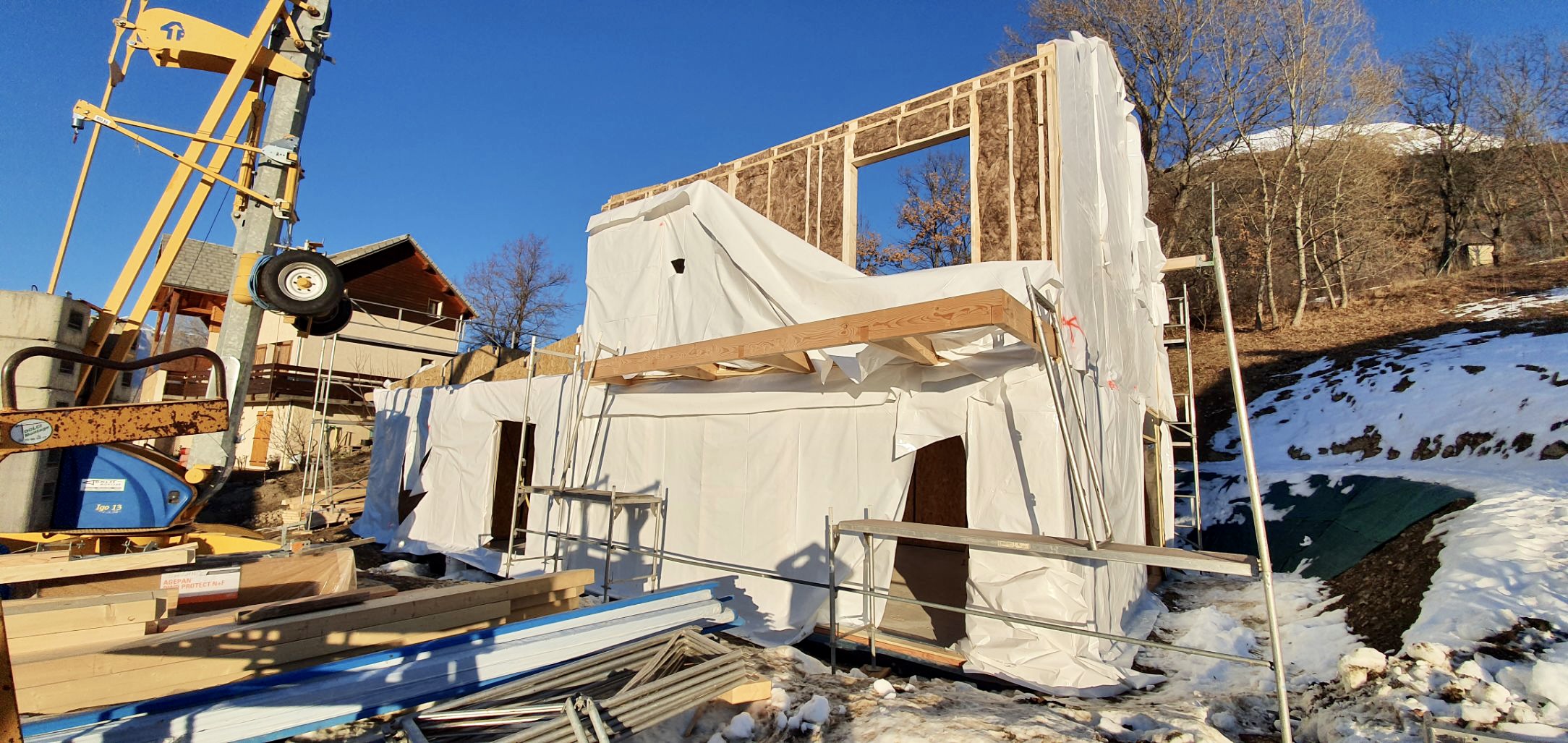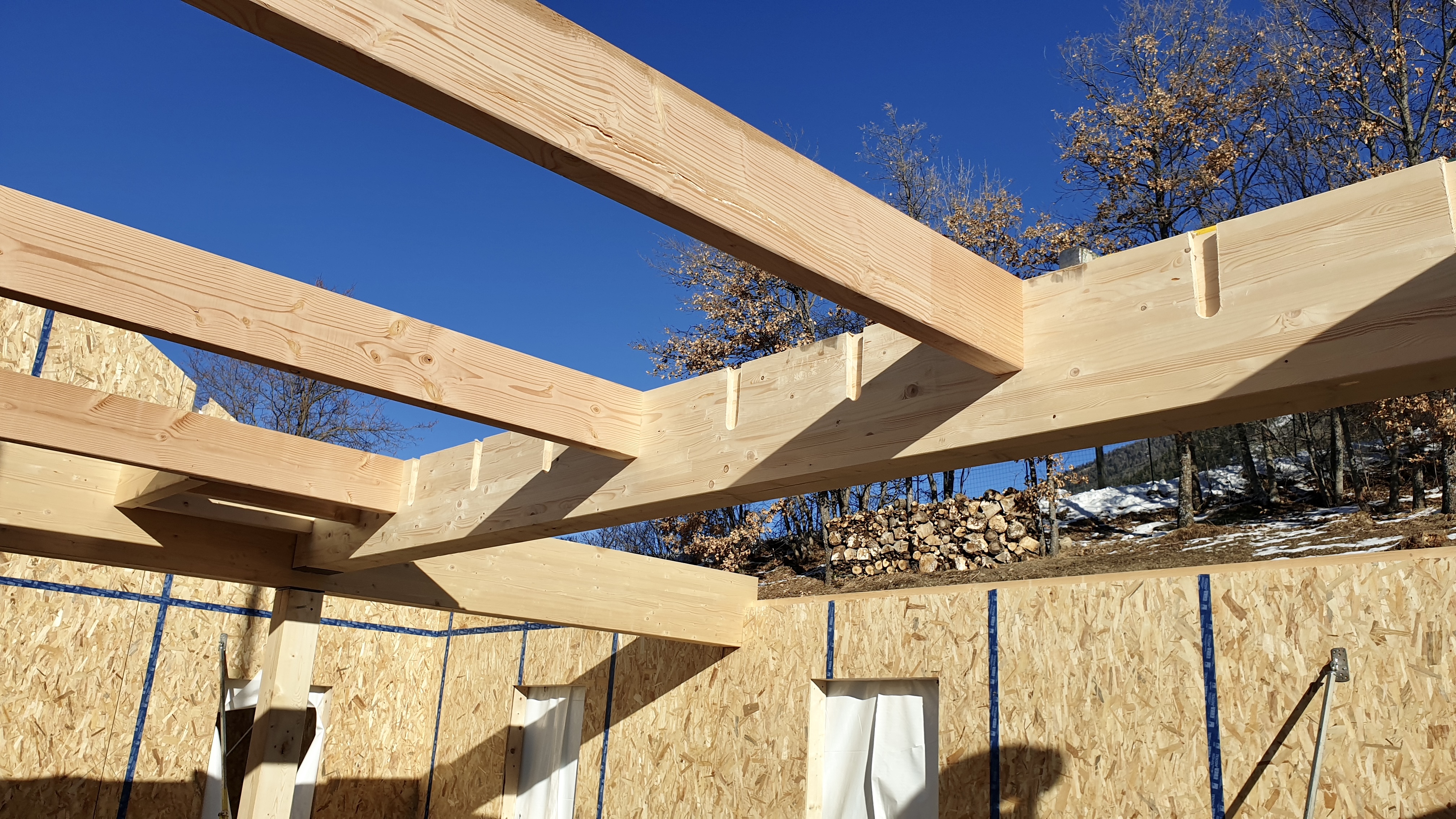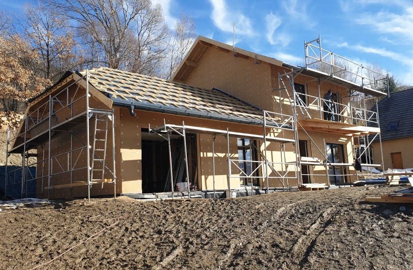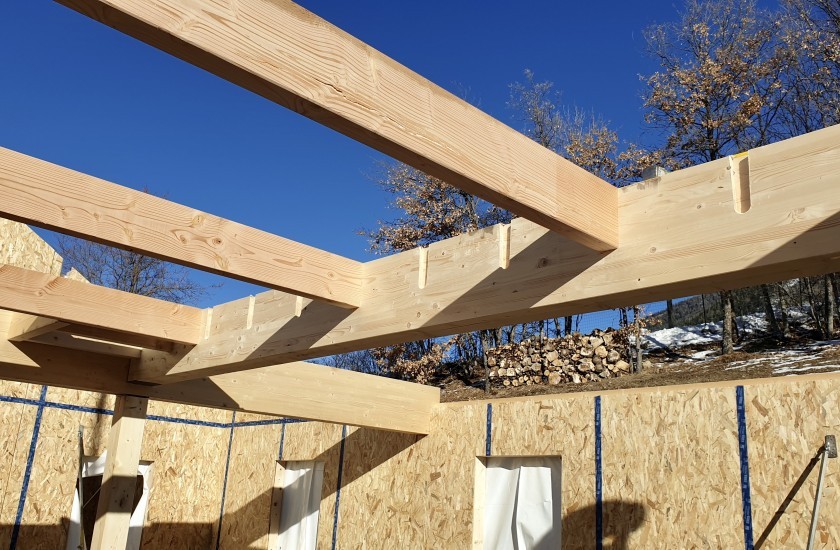 La charpente de la maison, réalisée en lamellé-collé d'épicéa, offre une solidité exceptionnelle et permet de grandes ouvertures, créant des espaces intérieurs lumineux et aérés. Nous avons utilisé du sapin et du mélèze certifiés "Bois des Alpes", garantissant une qualité supérieure tout en soutenant l'économie locale.
