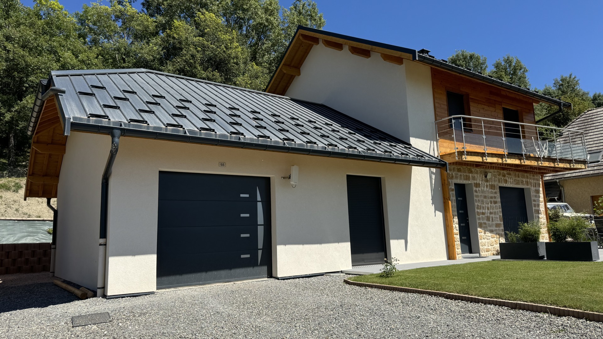 Le bardage horizontal en mélèze certifié "Bois des Alpes" de 23 x 132 mm donne à la maison une façade élégante et résistante. Le mélèze, réputé pour sa durabilité et sa beauté naturelle, ajoute une touche de caractère authentique à l'ensemble.